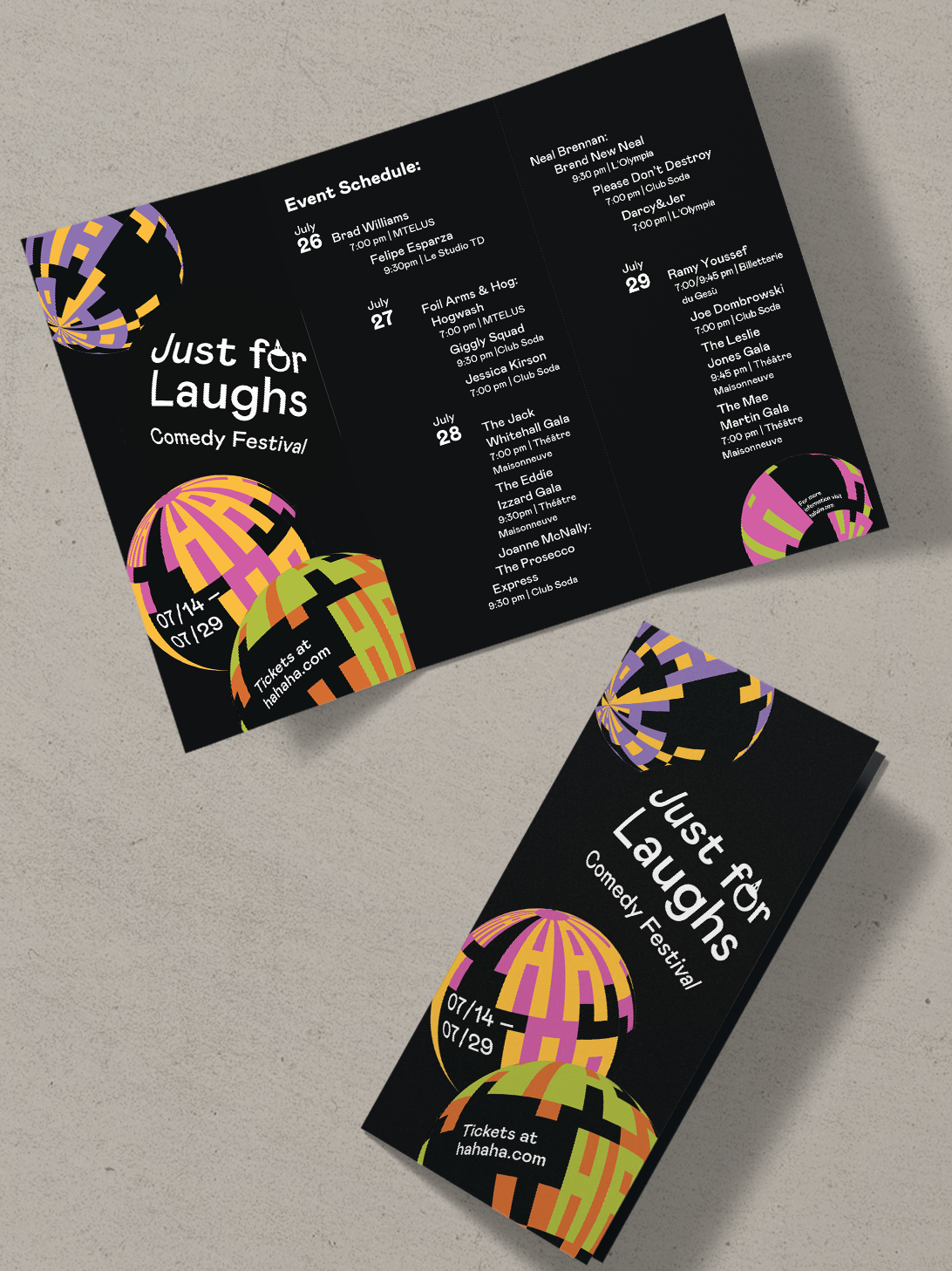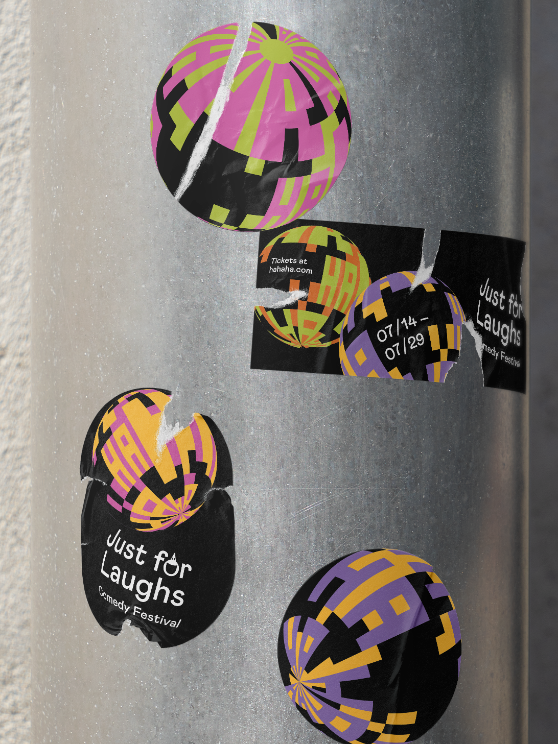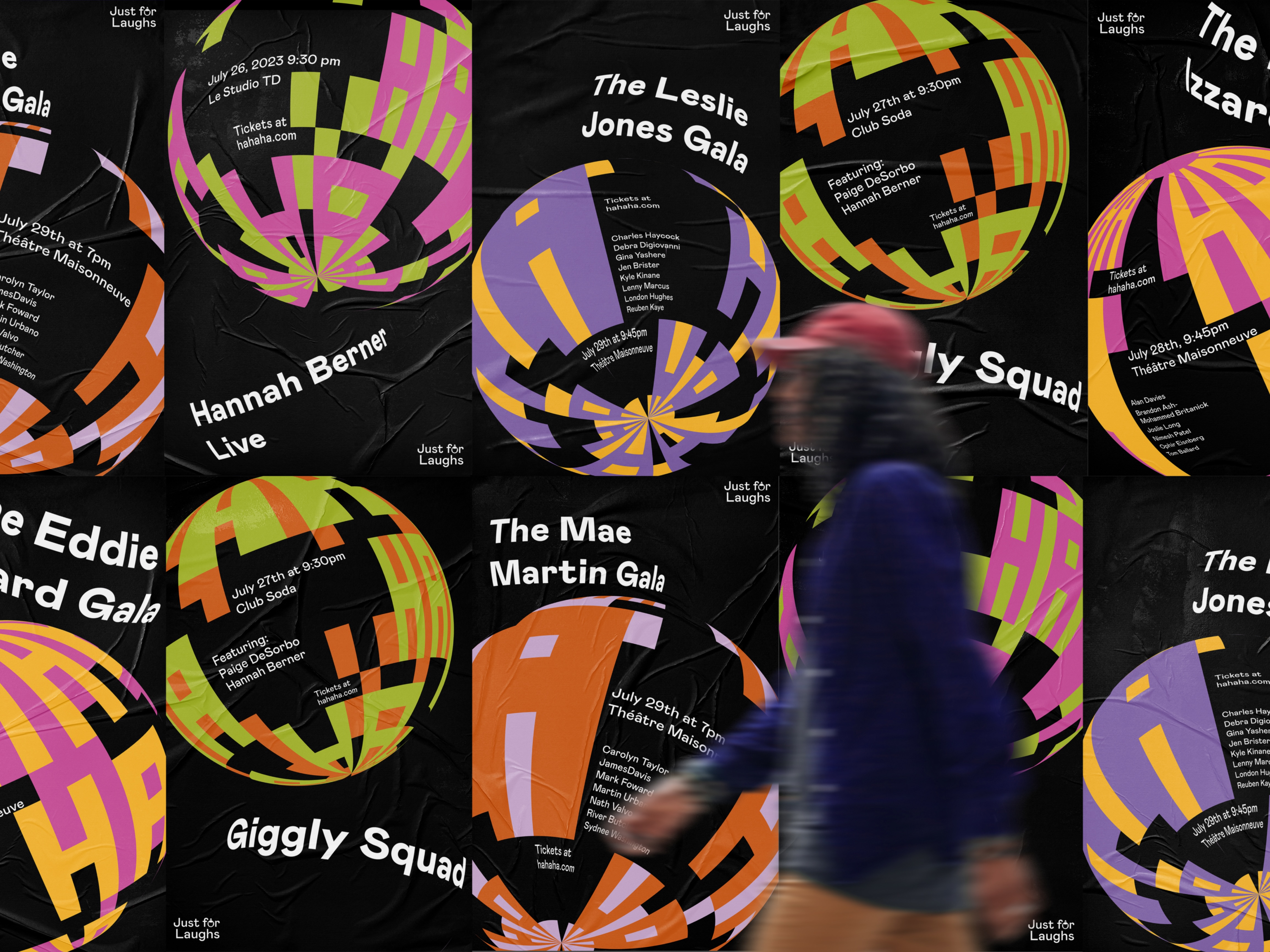For this spec project, we reimagined the Just for Laughs comedy festival with a flexible brand system built to match its electric, roll-with-the-punches spirit. The identity centers on bold, three-dimensional shapes that rotate, stack, and collide. These shapes are constantly in motion and together create a modular design system that can be easily adapted across posters, merch, digital assets, and event signage – giving every performer and event its own visual punchline. The result is a brand world that feels loud, lively, and unmistakably comedic.
