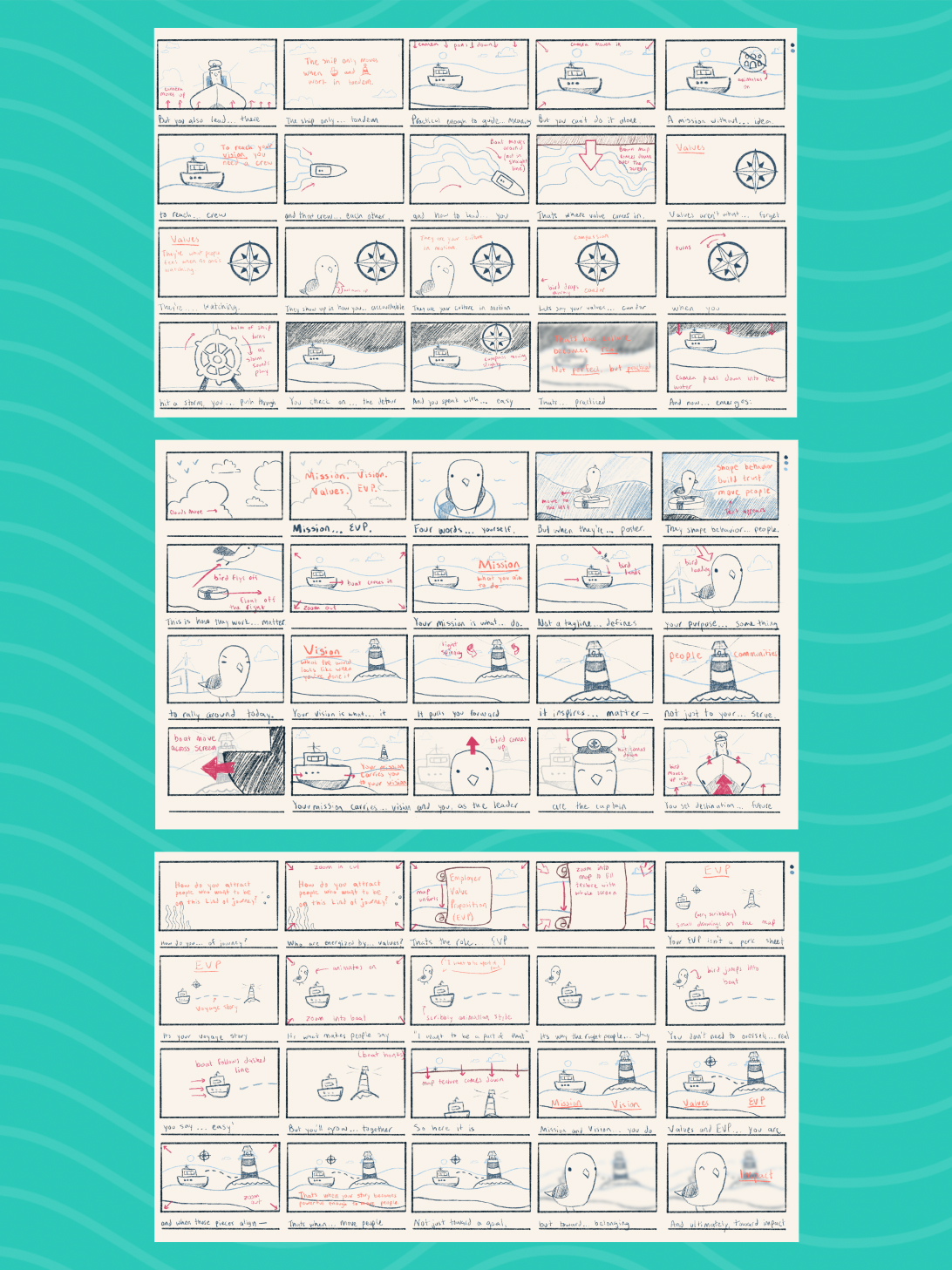Our friends at Storitel came to us with a question: how do you explain mission, vision, values, and EVP in a way that feels meaningful and memorable? Instead of sharing them as separate definitions, we turned them into a story. Mission became the vessel, vision the island on the horizon, values became the compass that keeps everyone on course, and EVP the tale of the journey itself. To guide viewers through this world, we introduced Fred, an optimistic and curious little bird who swoops in to make each idea feel welcoming and human. The final animation allows leaders to share a detailed understanding of concepts and terms that often remain abstract.